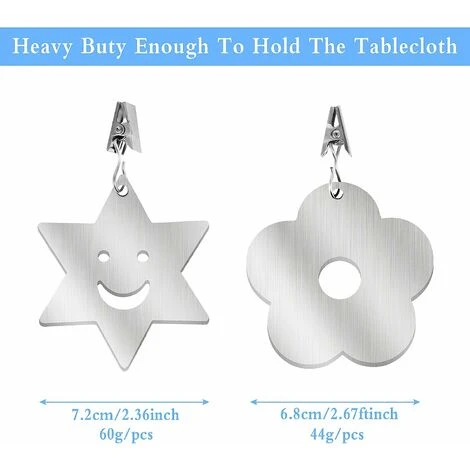 Différents poidsDeux poids sont disponibles pour le poids de la nappe en acier inoxydable, que vous pouvez utiliser selon vos besoins. Chaque pinces à Nappe en forme de fleur pèse 60 g et l’étiquette smiley pèse 44 g.