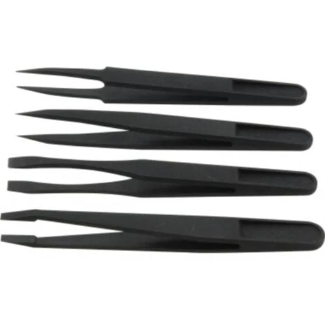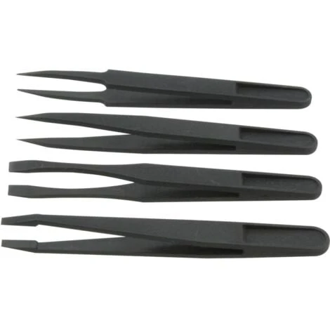 Quatres pincettes en plastique de haute qualité avec différentes pointes et une surface de préhension large. Pointes avec surfaces de préhension lisses.