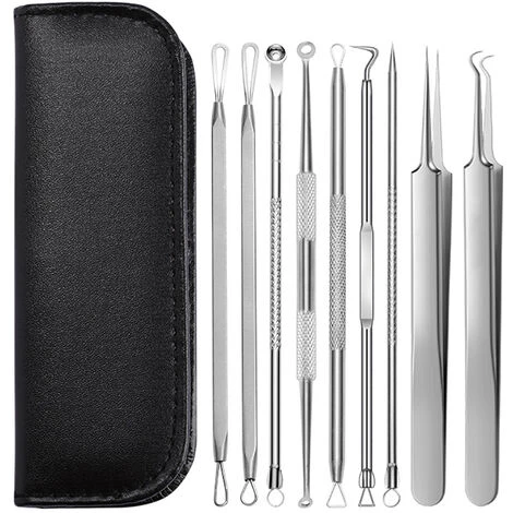 Kit extracteur de points noirs multifonction : 9 outils, boucles et pincettes de tailles différentes, qui peuvent aider à éliminer les points noirs, les canettes et diverses imperfections, garder votre visage propre et lisse sans rougeur ni cicatrice.