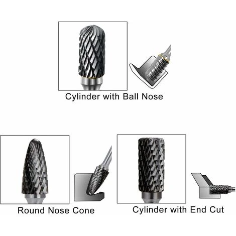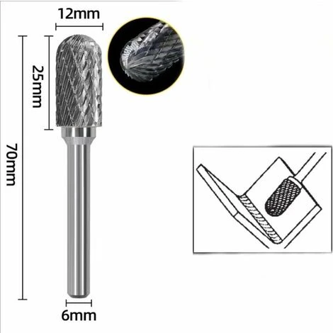 Forme: Cylindre à double coupe Forme du nez sphérique Type C, arbre : env. 6 mm; Diamètre de la fraise 12 mm, longueur de la tête 25 mm, longueur totale 70 mm;