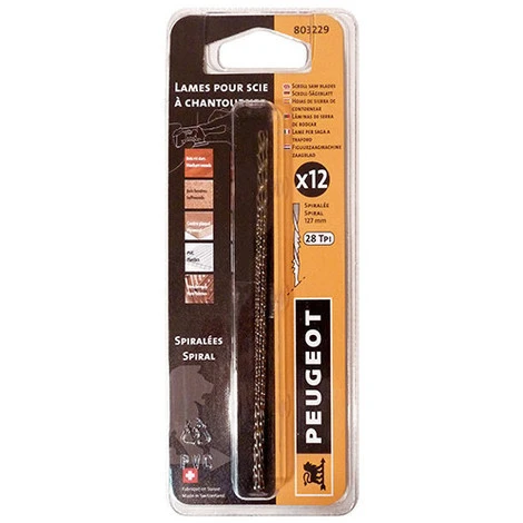 Jeu de 12 lames à chantourner spiralées D. 1,3 mm – 28 TPI – 803229 – Peugeot