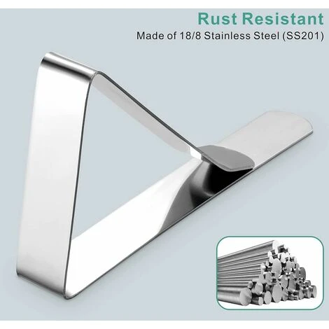 【Haute qualité】Ces clips de nappe sont en acier inoxydable 18/8, durables et antirouille. Les clips présentent un bord lisse et sans accroc avec une bonne élasticité, fixez fermement la nappe à la table.