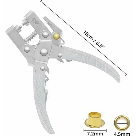 Ensemble de pinces à œillets : notre ensemble comprend une pince à œillets en acier robuste de 16 cm. Il y a aussi 100 yeux dorés avec un diamètre extérieur de 7,2 mm et un diamètre intérieur de 4,5 mm. Nos poinçons sont conçus pour des oeillets de 4,