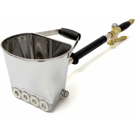 Facile à utiliser: plongez la trémie dans un seau plein de mortier, une fois remplie, le mélange constitué de ciment, d’eau de gâchage, de sable, de chaux ou d’autres adjuvants peut être aspergé de manière uniforme sur n’importe quelle surface verticale. Votre mur sera parfaitement lisse en un éclair: env. 30-40m² par heure!