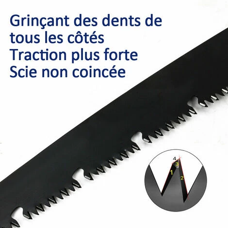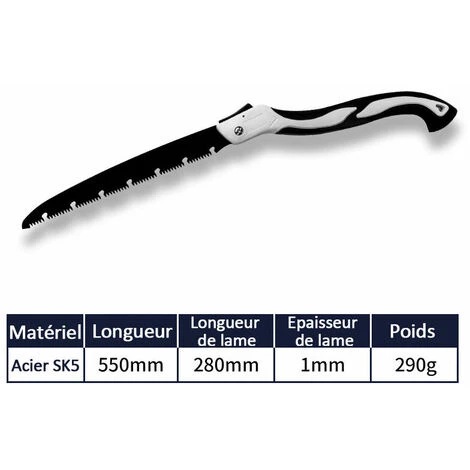 Materiau : lame en acier SK-5 de haute qualite et durable pour une coupe efficace lors de l’amenagement paysager de survie en camping et des travaux de jardinage generaux. De nombreuses scies a main sont fabriquees a partir de materiaux fragiles et bon marche qui se plient et meme se cassent apres quelques utilisations. Apres des semaines de tests, nous avons perfectionne la scie a main pliante.