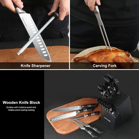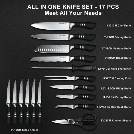 - 【Ensemble de couteaux 17-TIG】Bloc de couteaux en bois massif, couteau de chef 8″/21CM, couteau Santoku 7″/18CM, couteau à pain 8″/21CM, couteau à trancher 8″/21CM, couteau à steak 5″/12CM, 4.5″/ Couteau utilitaire 11,5 cm, couteau d’office 3,5″/ 9 cm, couteau à bec d’oiseau 3,5″/8,5 cm, fourchette à viande 11″/27 cm, ciseaux de cuisine 8″/21 cm, acier à aiguiser 12″/31 cm. Répond à tous vos besoins.