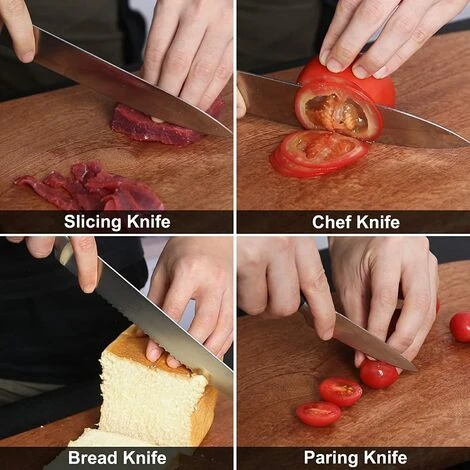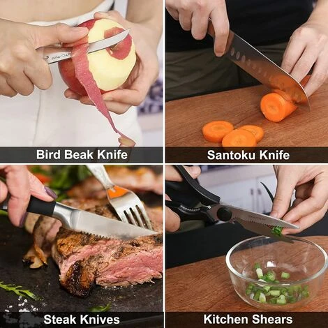 - 【Ensemble de couteaux de haute qualité】Affûtage longue durée, Stable et flexible grâce à l’acier inoxydable à haute teneur en carbone X50Cr15, Corps de couteau monobloc qui élimine le risque de chute du manche, Manche ergonomique pour éviter la fatigue des mains, Également avec antidérapant conception. La conception générale est simple et soignée, et elle peut être assortie à tout type de vaisselle et cuisines avec différents styles de décoration.