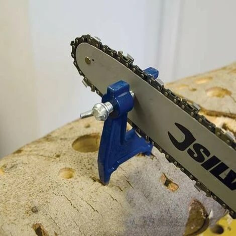 En acier moulé. Pourvu de deux pointes à enfoncer dans le bois. L’écrou papillon de serrage se fixe sur le guide-chaîne.