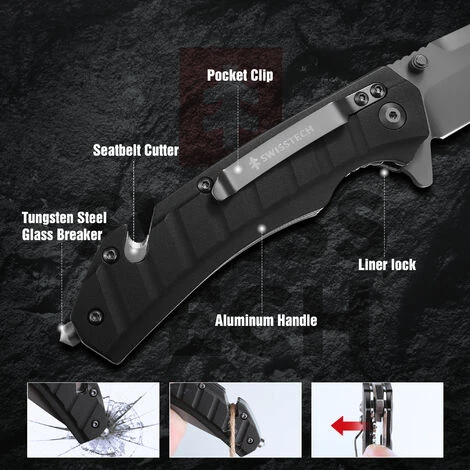 【Conception multifonctionnelle】Swiss+Tech couteau pliant est équipé d’un clip de poche pratique pour un transport facile. La fente pour le pouce vous aide à l’ouvrir rapidement. Le brise-vitre en acier au tungstène peut être utilisé dans des situations inattendues. Le coupe-corde est adapté à un usage quotidien