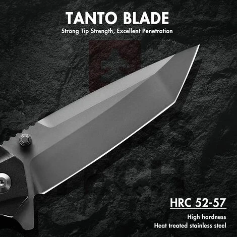【Lame de haute qualité】La lame est en acier 7CR17MOV qui est connu le traitement thermique, elle est solide, durable, résistant à la corrosion et facile à nettoyer. Et la lame TANTO possède une forte force de coupe et un excellent pouvoir de pénétration. Sa dureté de la lame atteint HRC 52-57