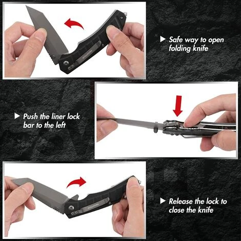 【Liner lock fiable】Liner lock non seulement facile à utiliser et la vis rotative de précision, mais aussi offrent une protection fiable et ferme lorsque vous utilisez le couteau pliant, et empêchent la fermeture accidentelle